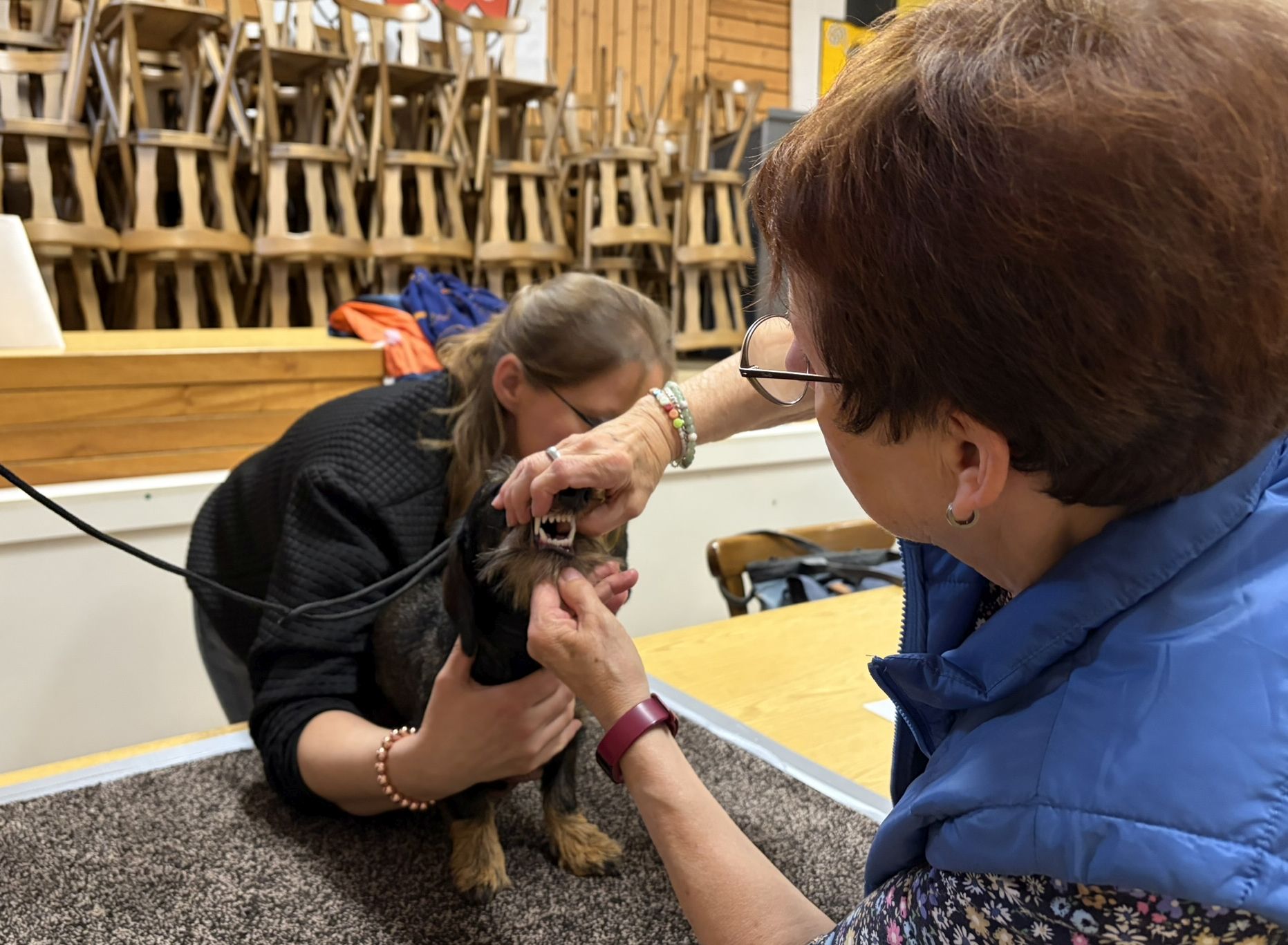 Zuchtrichterin Heike Behring überprüft den Zahnstatus der Rauhaarhündin, die ihr strahlend weißes und vollständiges Gebiss zeigt.