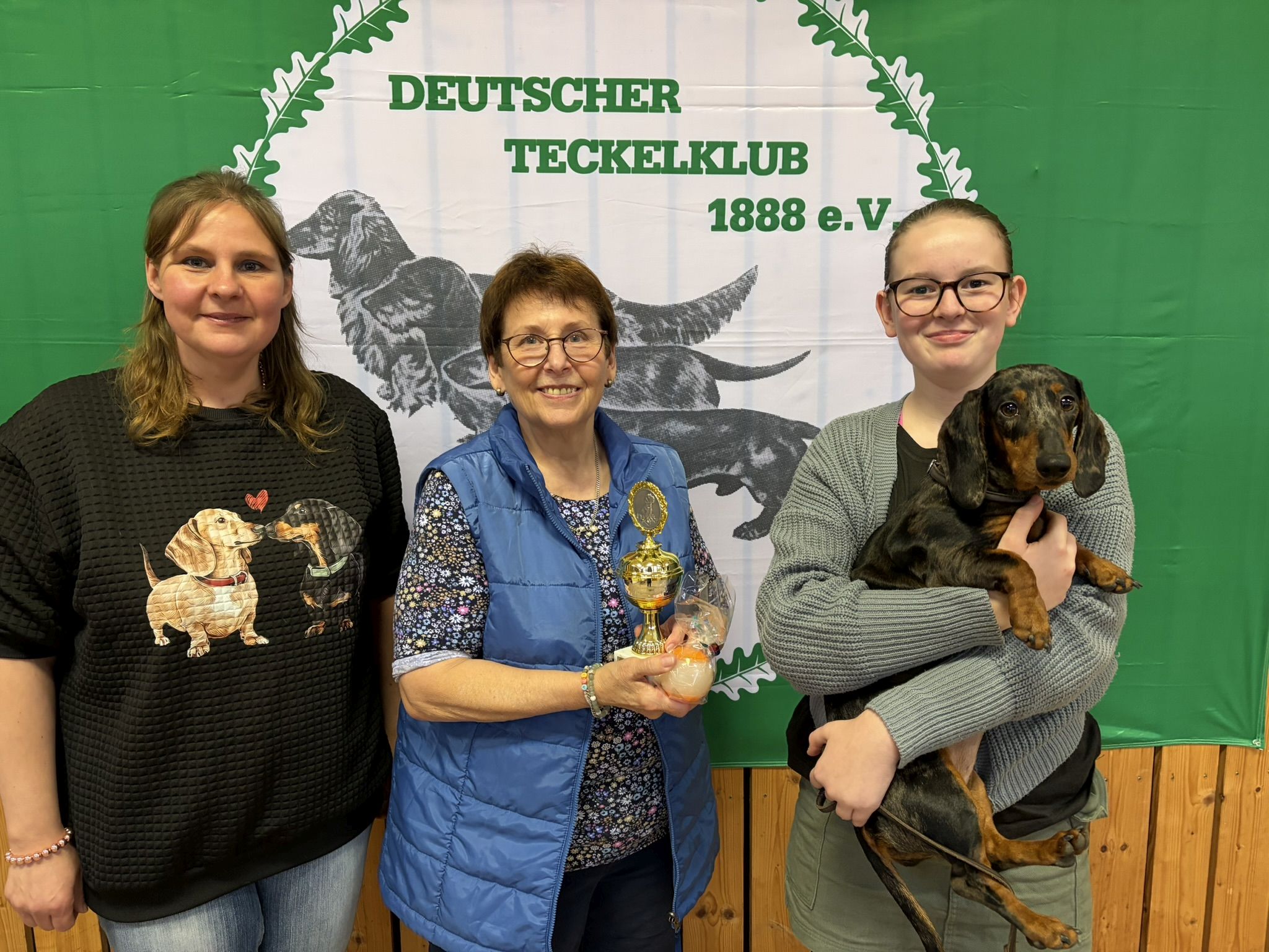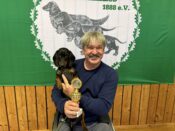 Die Hände reichten nicht für alle an diesem Tag gewonnenen Preise. Lea Armann entschied sich für die Siegerschleife und den Pokal für den Tagessieg. Stolz blickt der schönste vorgestellte Dackel der Zuchtschau Finja vom Teufelsholz in die Kamera.
